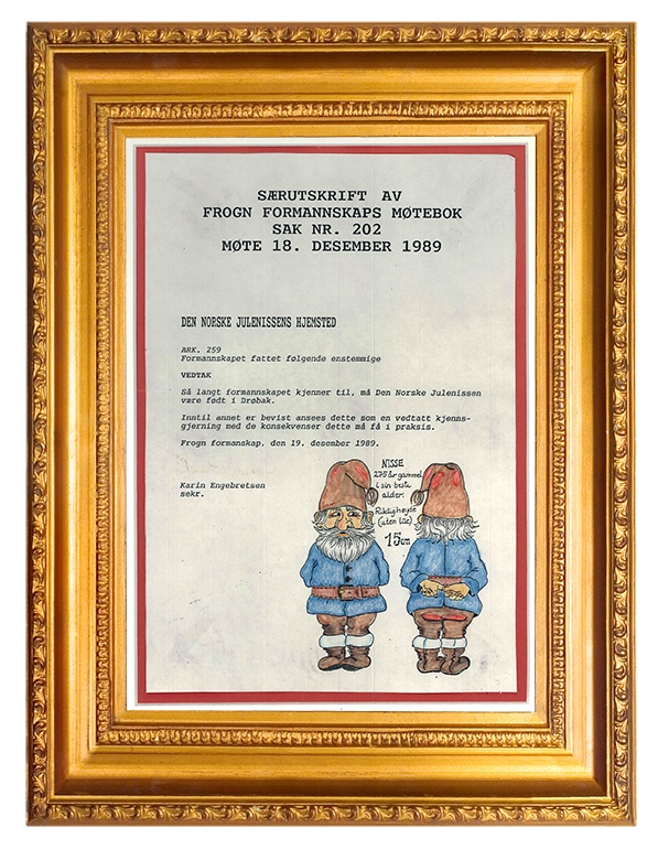 "Så langt formannskapet kjenner til, må den norske Julenissen være født i Drøbak. Inntil annet er bevist, anses dette som en vedtatt kjensgjerning med de konsekvenser dette måtte få i praksis."