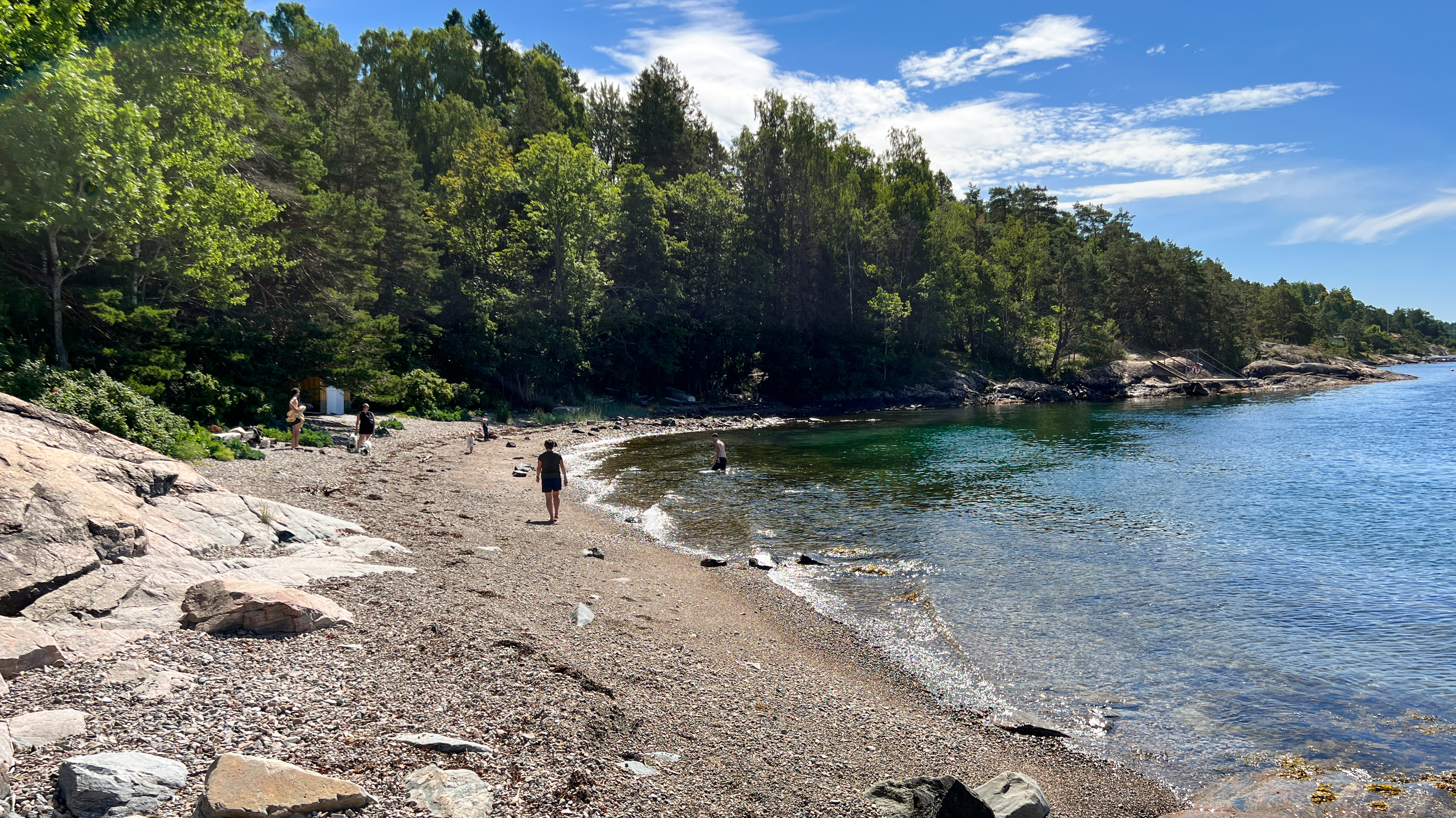 En fin steinstrand i en liten bukt, som også egner seg utmerket for å overnatte i hengekøye. Her er det nemlig flere trær ned mot stranden, som man også passerer hvis man går kyststien fra Hvitsten mot Skiphelle. På stranden vokser det strandkål, som egner seg godt til matlaging. Badesko kan være lurt!
